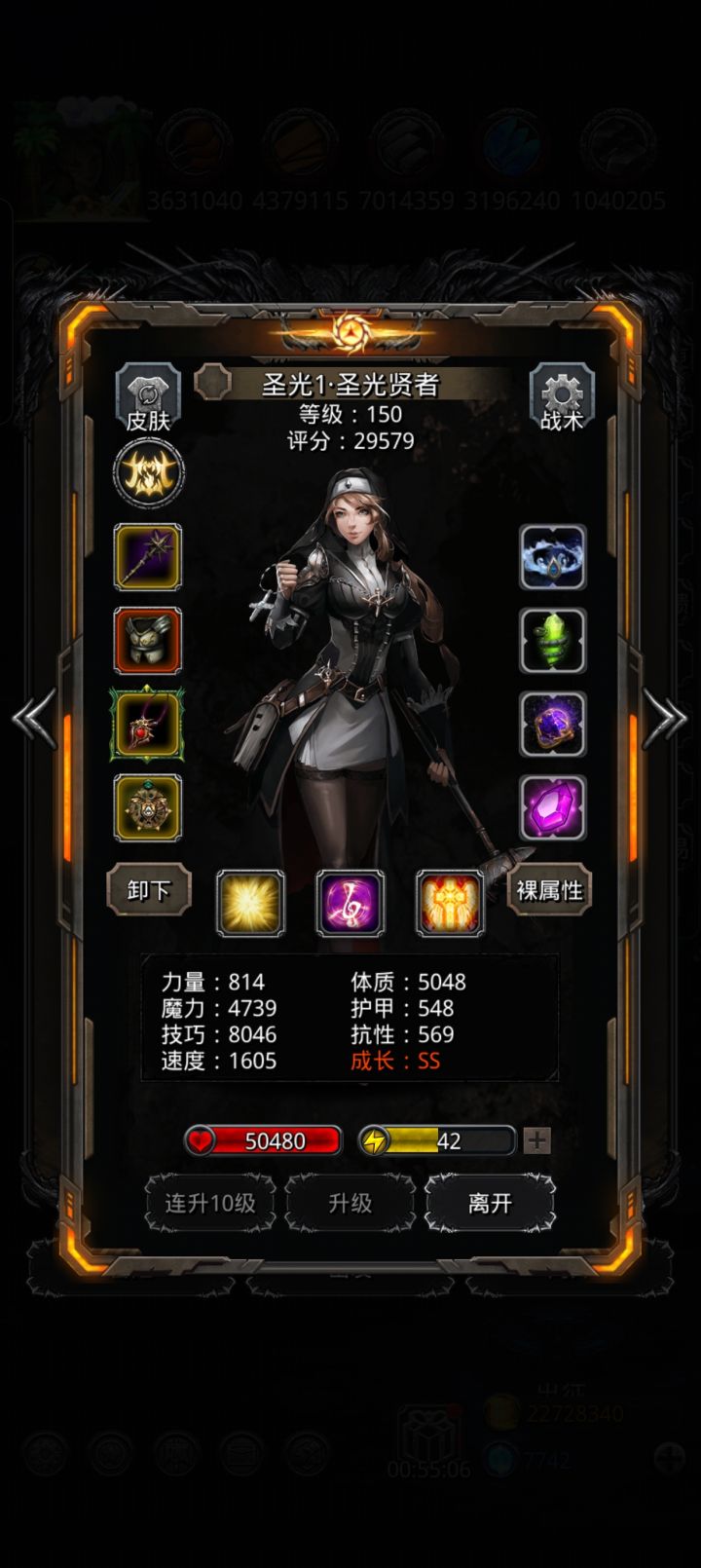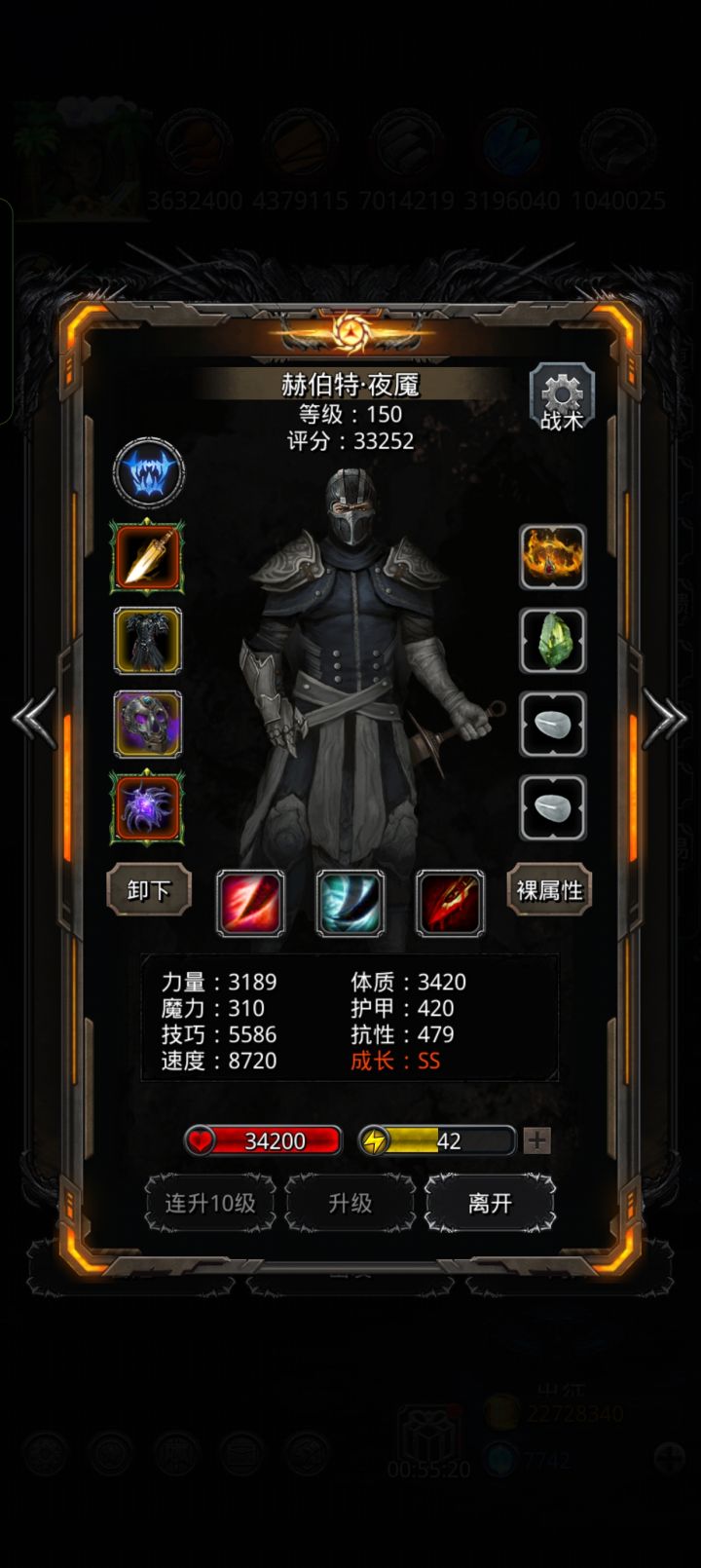 激活月之宗主,能叠起来后面很稳。夜魇叠下闪避,莽荒带150无视,我的只有60多力的150无视,有好的魔石时间估计更快。