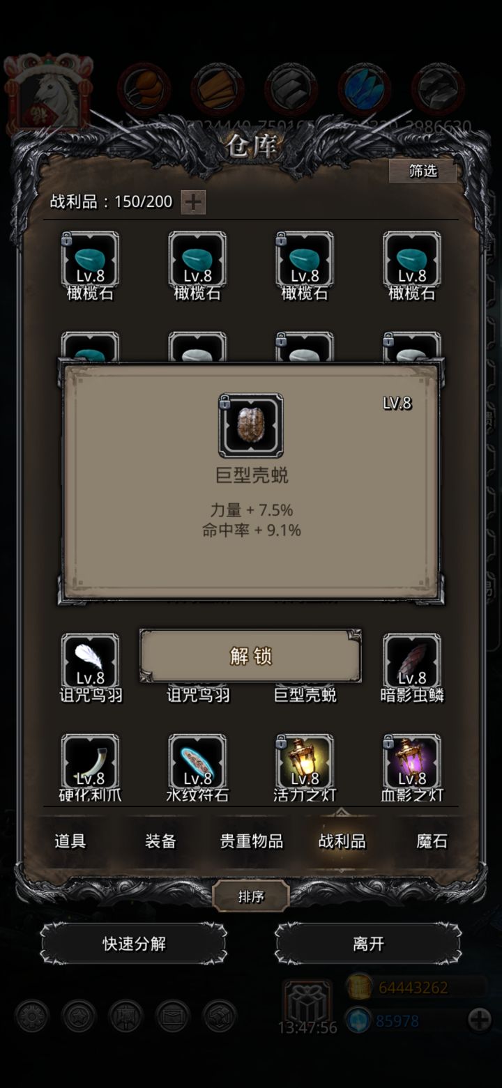 终于轮到我出货,7.5力9.1命,饱和度86.3%,昨天图23小怪掉的巨型壳蜕,今天早上用冒险的武器升的居然没有歪