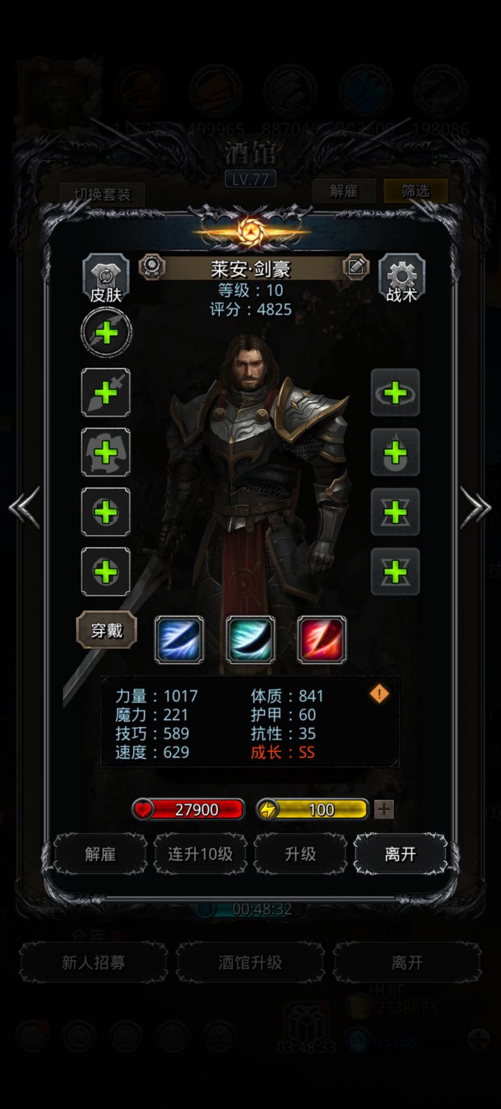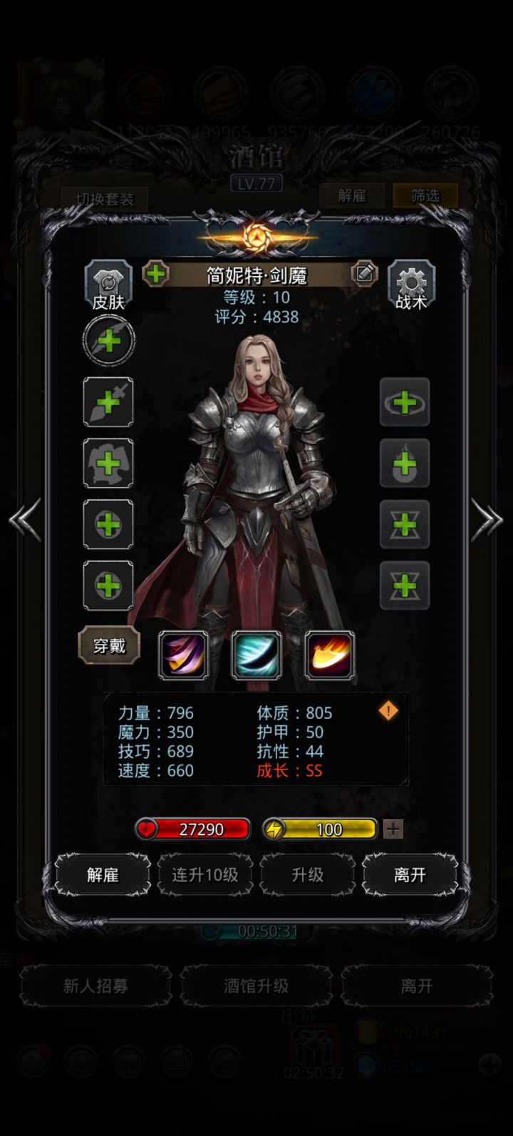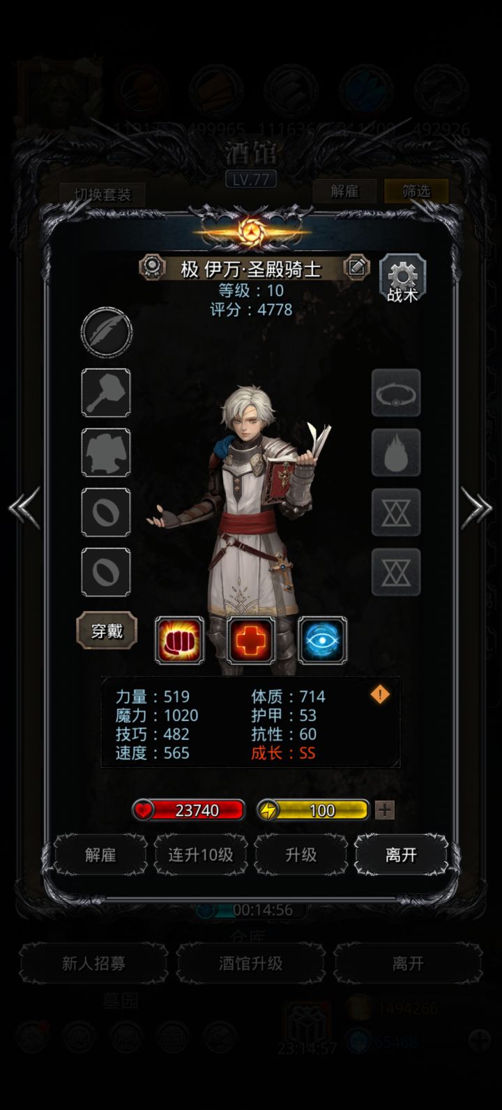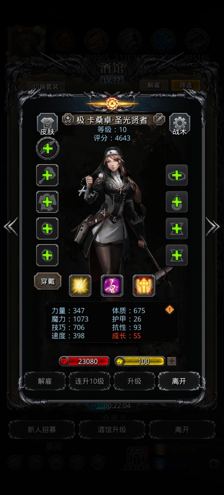 基本都是前期开荒老臣了,还有副队,本次共退休20人,特此留贴记录。1黑骑,1剑豪,1圣龙,1剑宗,1剑魔;1夜魇,1夜莺;1圣殿,3圣光,1神官;1狂战,1毁灭;1烟斗传,1烟斗龙,1圣枪,1烈枪;1冰法,1传法。以上基本都是及格或者小极,个人体感来看,通关还是略显吃力,所以除了 剑魔、剑宗、毁灭 这仨对属性基本无要求的,其他职业低于图中数值的不太建议留了,不然需要在其他方面(装备