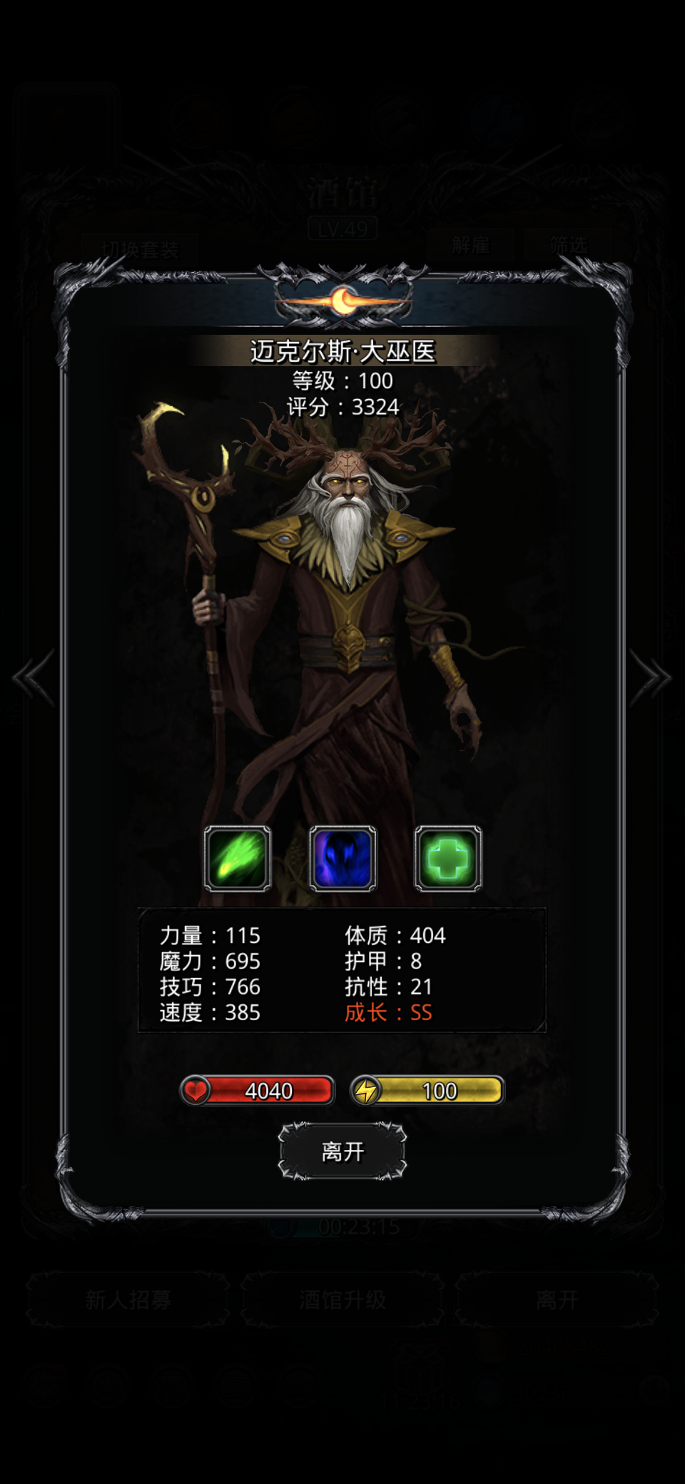 图26最终BOSS守墓人,配装按攻略调了好几次,最后这套最稳。神官还是自动好,手动根本来不及,五连鞭一不留神就会有暴毙的!BOSS-10%闪避,输出圣枪和蛮子命中80%-90%够用,不暴毙输出都够,圣枪带双吸,蛮子单吸。最终配装调整如下,从左到右依次:圣枪:虫皇甲和英雄盾都是50%刷脸,英雄盾换成蛇盾可以来个保底,战利品双物吸;祭司:地锤、妹甲、绿龙和金盾,魔石龙巫妖,战利品星国和技巧回复