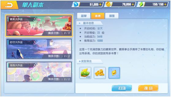 糖果大作战,防守大作战,泡泡大作战单人副本每一个都是获取资源的重要副本,升级宠物,大量金币,进阶宝物等在这里你都可以获得!所以每日挑战资源副本,才是快速提升战力的途径!在界面玩法中点击单人副本即可自由选取副本进入,每个副本每人每天只能挑战2次,单人副本目前有三种难度可以选择,随人物等级解锁相应的难度等级,当然掉落的东西也会越来越丰富,今天我们就跟着小编来看看关于糖果大作战的玩法!糖果大作战这