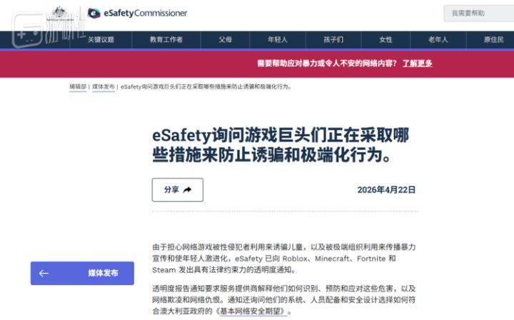 4月22日,澳大利亚网络安全监管机构eSafety宣布,已向Valve旗下游戏平台Steam,以及Roblox、《我的世界》和《堡垒之夜》发出具有法律约束力的“透明度通知”,要求相关平台说明它们“如何识别、预防并应对未成年人被诱骗、性勒索、青少年激进化,以及网络霸凌、网络仇恨”等问题。如企业未按要求回应,最高可能面临每天82.5万澳元的经济处罚。这并不是Valve第一次因为被指放任极端内容而面临
