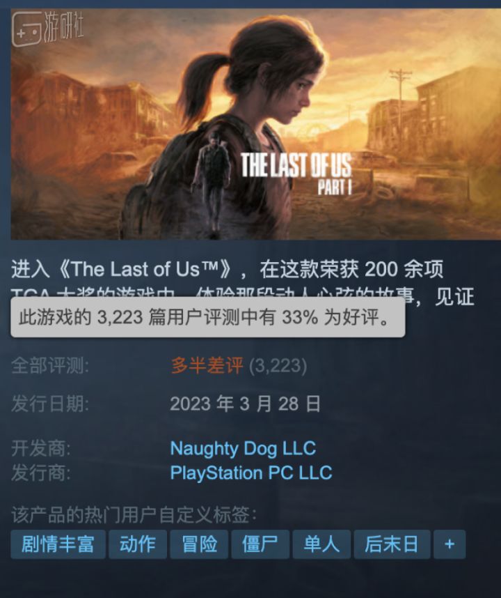 社友们早上好,以下是实习生带来的游研早报:1.《最后生还者 第一部》PC版现已正式发售,但表现并不良好。Steam好评率仅为33%,被评为“多半差评”。游戏的优化水平欠佳,无法进入游戏、帧数过低、闪退等问题时有发生。2. 动视暴雪CEO Bobby Kotick 在致员工的邮件中表示,索尼和动视暴雪已有近30年的合作关系,索尼近期想要全力阻止收购的行为很难不令人失望,但这件事并不会影响到双方的