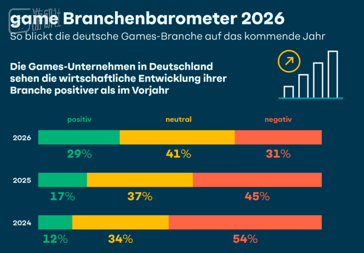 最近的德国游戏行业,展现出了格外乐观的整体情绪。据德国电子游戏行业协会出具的《2025产业年度报告》显示,超过半数的德国游戏公司都预计2026年的业务运营将出现积极增长。29%的公司则认为情况会比上一年更好——这个数字几乎是2025年的两倍。德国游戏产业协会发布的年度游戏行业晴雨表,显示出行业情绪近三年年来正缓慢好转充足的信心,得益于新一任德国联邦政府对于游戏行业的积极态度,其中最实在的,要