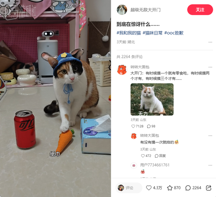 最近,我在刷视频时经常听到一句拉长声音、语尾上扬的:“胡萝卜,纸巾,真——棒!”这个梗出自于一只名为大开门的三花猫。在几段小视频里,大开门的主人想训练它辨别物体——主要是纸巾,并把玩具胡萝卜当成了干扰项,名台词由此而生。在日复一日的练习中,大开门的蒙题能力和察言观色能力得到了显著提升:有纸巾选纸巾,没有纸巾选胡萝卜,甚至一度突破了识物的题干,蒙出了“击毙”倒地的钝角选项,直到听到那声熟悉的“真