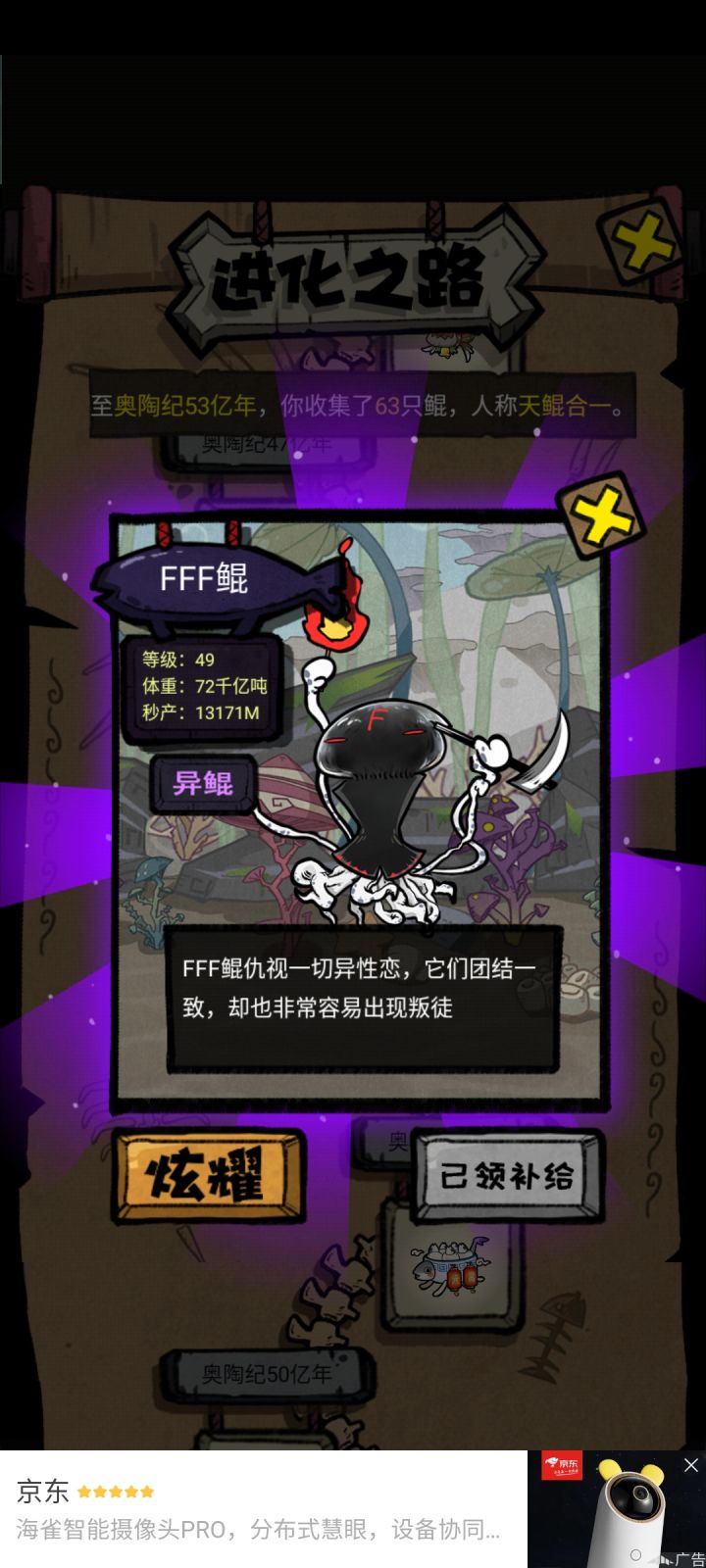 这个游戏目前最高55级是神粽鲲,希望官方多出点,前期建议神通就优先挂机和变异,没必要一直看广告,基本4小时一登就可以升一级,然后这个游戏最最有意思的就是变异,因为这个变异是有概率的,要看脸,每个人只能有几只,而且你有的也不一定好看,说下个人觉得好看的几个雷影鲲,滑稽鲲,蔡徐坤和麻花藤,猿魔其实也还行,其他的就很丑,再说下这个游戏的决斗,就是扔骰子,这个就特别恶心了,输了直接给你扣20%的能量必须看