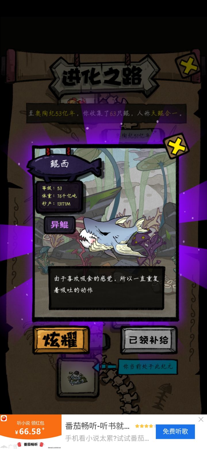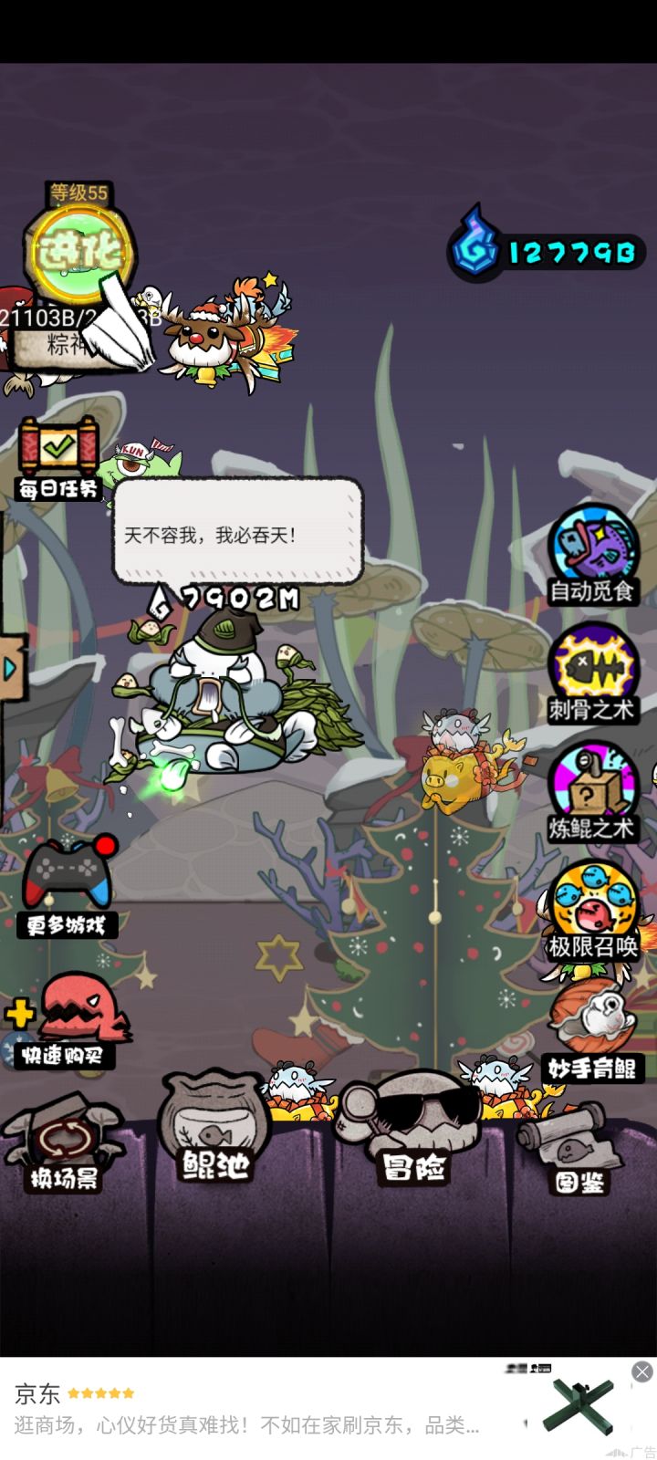 这个游戏目前最高55级是神粽鲲,希望官方多出点,前期建议神通就优先挂机和变异,没必要一直看广告,基本4小时一登就可以升一级,然后这个游戏最最有意思的就是变异,因为这个变异是有概率的,要看脸,每个人只能有几只,而且你有的也不一定好看,说下个人觉得好看的几个雷影鲲,滑稽鲲,蔡徐坤和麻花藤,猿魔其实也还行,其他的就很丑,再说下这个游戏的决斗,就是扔骰子,这个就特别恶心了,输了直接给你扣20%的能量必须看