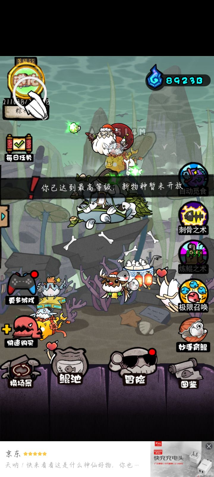 这个游戏目前最高55级是神粽鲲,希望官方多出点,前期建议神通就优先挂机和变异,没必要一直看广告,基本4小时一登就可以升一级,然后这个游戏最最有意思的就是变异,因为这个变异是有概率的,要看脸,每个人只能有几只,而且你有的也不一定好看,说下个人觉得好看的几个雷影鲲,滑稽鲲,蔡徐坤和麻花藤,猿魔其实也还行,其他的就很丑,再说下这个游戏的决斗,就是扔骰子,这个就特别恶心了,输了直接给你扣20%的能量必须看