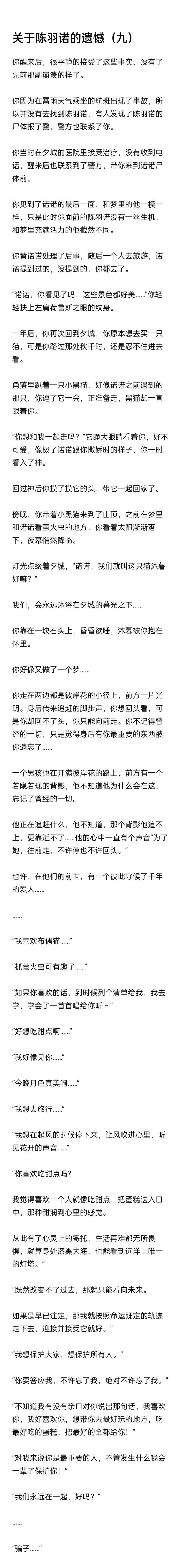 打出两个BE之后浑浑噩噩好几天,不得不说实在是太刀了呜呜呜。我第一次玩游戏哭得这么惨,和两个闺蜜哭诉之后多了两个和我抢诺诺的情敌。握拳。由于虐的心肝儿疼所以自己肝出一篇同人,算是臆想中的真结局的后续,加上了一点儿不知道对不对的自己的猜想。由于图太大所以就截开了,剩下的发在评论区。第一人称视角,模糊化了“我”的性别,毕竟游戏里可以选性别。最后嗷一句——陈羽诺,我喜欢你!