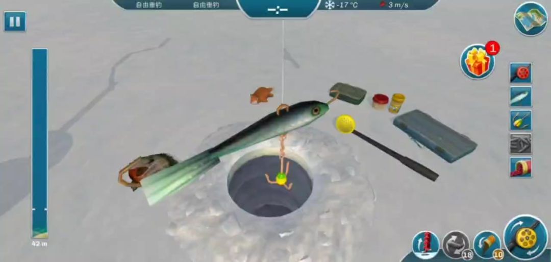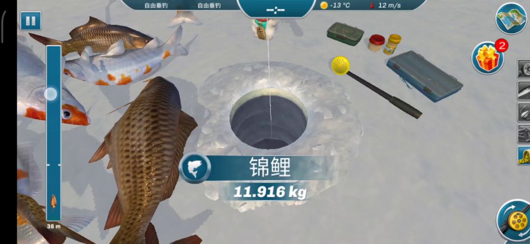 钓法:钓法的话不需要太专业摇两下数三个数然后继续摇两下数三个数,我用的小钻头,所以一旦出现杆弯的巨夸张不抬头的就不用收杆,不收杆就不会断线!!接着摇就行,这局的话前五分钟没上鱼,后面也是只钓了两种就第二了。