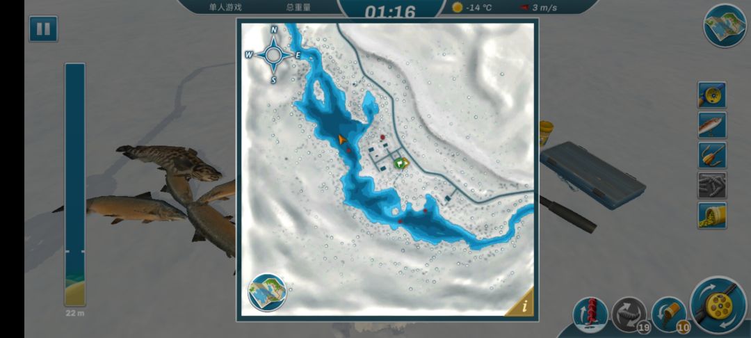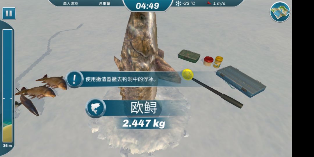 我用的是一个重杆和一个中杆,开局前可以先在商店选择中杆和适合的拟饵,进去直接点深度然后找地方开钓,中杆就钓中等水域和上层,基本上就是胖头鱼、欧巡,黑鲶鱼,上层基本上出大口黑鲈和小口黑鲈,如果风暴把你刷出去了就上杆直接跑圈中心的钓点,蹭别人的洞,节省时间,上个两三种就换重杆直接沉底摇一摇钓鲤鱼,很简单就可以拿个第一第二。