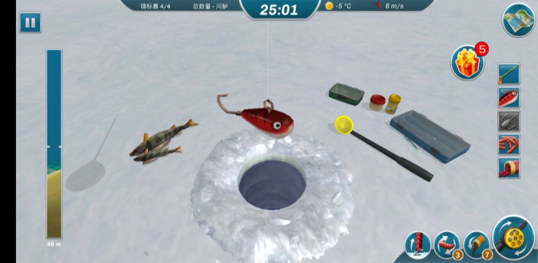 1.地图选择最下面两个地图中的一个,我习惯龙山 2.比赛时间选10分钟,时间短人机不会夸张,时间选冬天 3.最重要的一点就是选择比鱼种类,因为龙山鱼种少 4.开缩圈,让人机多跑跑 我用的是一个重杆和一个中杆,开局前可以先在商店选择中杆和适合的拟饵,进去直接点深度然后找地方开钓,中杆就钓中等水域和上层,基本上就是胖头鱼、欧巡,黑鲶鱼,上层基本上出大口黑鲈和小口黑鲈,如果风暴把你刷出去了就上杆直接跑圈中心的钓点,蹭别人的洞,节省时间,上个两三种就换重杆直接沉底摇一摇钓鲤鱼,很简单就可以拿个第一第二。 钓法:钓法的话不需要太专业摇两下数三个数然后继续摇两下数三个数,我用的小钻头,所以一旦出现杆弯的巨夸张不抬头的就不用收杆,不收杆就不会断线!!接着摇就行,这局的话前五分钟没上鱼,后面也是只钓了两种就第二了。