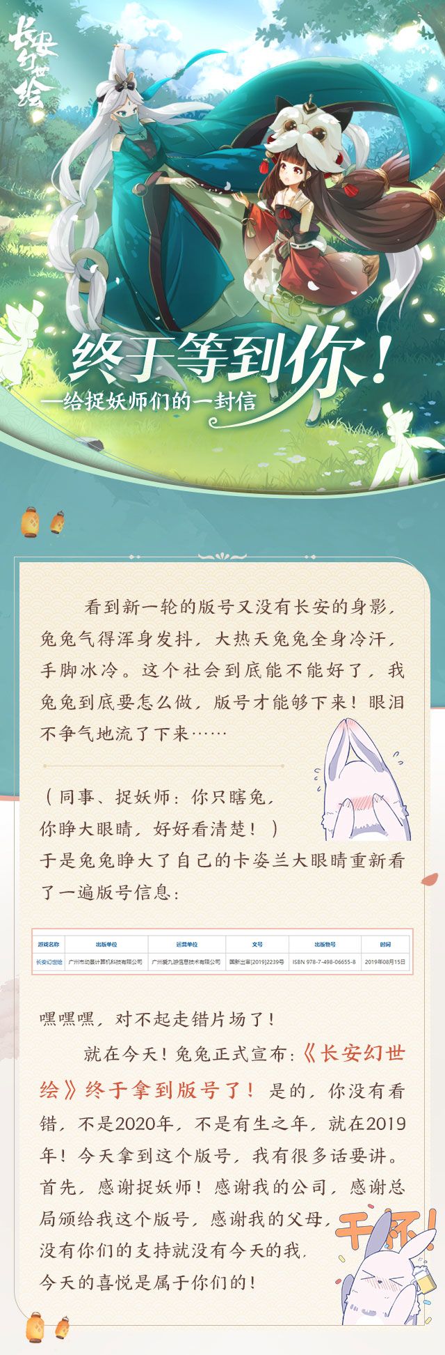 (很多捉妖师问为什么还在还是测试,因为公测前必须进行付费删档测试,无论是前期拿到版号的闪闪还是轩辕剑都是,大家都可以去看看。而且付费测在公测是有返利的,请大家的等待兔兔后期的消息同步!)好久没有给大家发推送了!请大家收藏、点赞、评论三连一下本帖吧!啊!让三连的烈火来得更猛烈些吧!兔兔将会在评论中抽取10位捉妖师赠送妖灵立牌*1要是还能给个5星星庆祝一下版号下发就更好了,嘿嘿嘿(今天是一只得寸