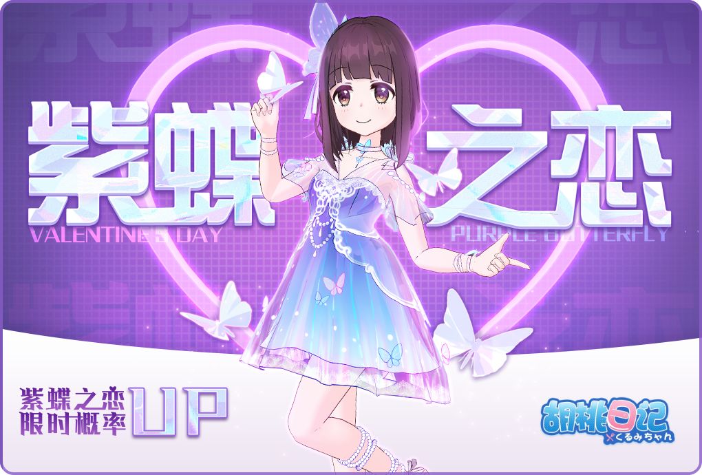 2月14日5:00至3月2日23:59,《胡桃日记》游戏内将开启新一期福袋奖池,新增特等奖“紫蝶之恋”连衣裙并限时概率UP! 穿上这套仙气飘飘的连衣裙,不但能令胡桃一秒化身紫蝶精灵,还能带来额外的好运加持哦~