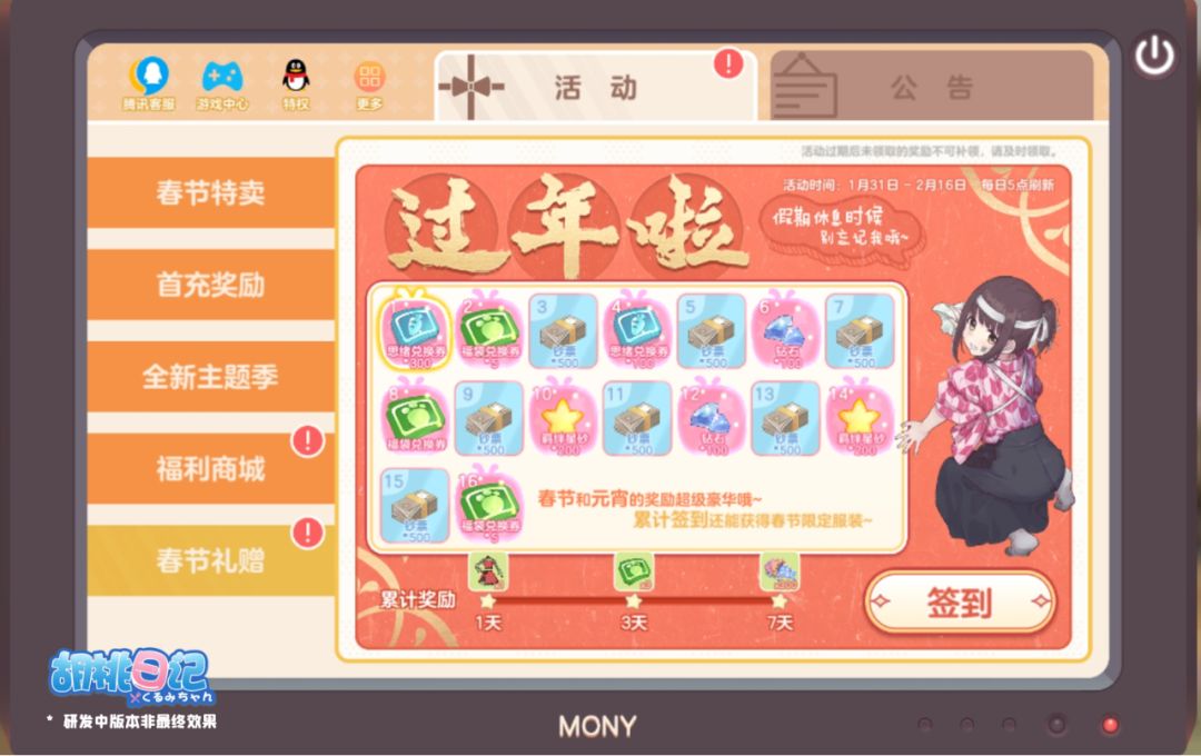虎年将至,"胡"虎生威~《胡桃日记》春节福利版本也如约上线啦!这一次,胡桃将在游戏内陪你度过一个完整的春节假期,现在就一起来看看具体内容吧! 春节期间(1月31日除夕-2月16日)《胡桃日记》游戏内将上线“春节礼赠”签到活动,每天登陆都有丰富道具免费领,连续登录签到达到指定天数,还有更豪华的专属奖励,从除夕一直持续到元宵节后! 为了让大家都能轻松感受其乐融融的春节氛围,让胡桃穿上新衣过大年,制作团