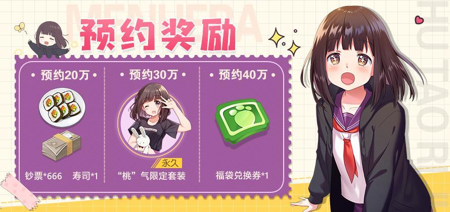 本兔叽喜气洋洋出场,不要问我为什么,问就是《胡桃日记》TAPTAP预约活动开始了! 为了感谢大家~我们为大家准备了非常丰富的预约奖励,嘿嘿嘿~快来看看都有哪些意想不到的好~东~西吧! 《胡桃日记》预约奖励大公开! 1、预约用户数达到20W,获得钞票×666(游戏货币)、寿司×1(游戏道具) 2、预约用户数达到30W,获得“桃”气限定套装×永久(游戏道具) 3、预约用户数达到40W,获得福袋兑换券×