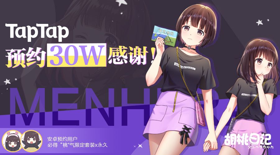 感谢桃子们的陪伴,《胡桃日记》已在TapTap达到30W预约啦~ 撒花~鼓掌~✿✿ヽ(°▽°)ノ✿~ 不负桃子们的喜爱,兔叽准备了专属大礼哦: ①在TapTap预约的所有安卓桃子们,游戏不删档后必得兔叽赠送的“桃”气限定套装×永久(参考↑上面七濑胡桃身穿的美衣和裙子哟~); ②本帖留言中随机抽取10位幸运玩家获得胡桃个人照明信片×6枚/1组; ③本帖留言中再次随机抽取20位幸运玩家获得《胡桃日记》