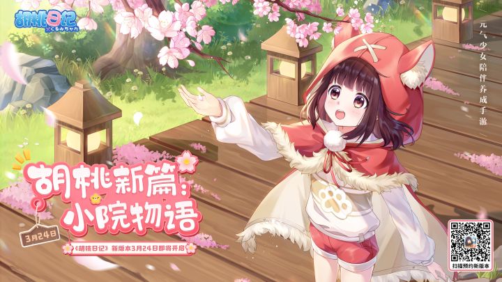 嗨~你来啦!今天胡桃特别开心,因为胡桃自己的游戏《胡桃日记》全新版本——“胡桃新篇:小院物语”已经确定在3月24日上线啦!掰掰指头数一数,好像再等不久就能玩到了!耶!下面,就让胡桃来给你介绍一下这次的新版本都有哪些主要内容吧!【胡桃小院开张啦,解锁屋外新惊喜】这次版本更新后,终于不用每天只宅在房间里,胡桃可以和你一起随时去屋外看看咯~这个小院,是爷爷留下来的,可惜荒废已久,我们这次的目标就