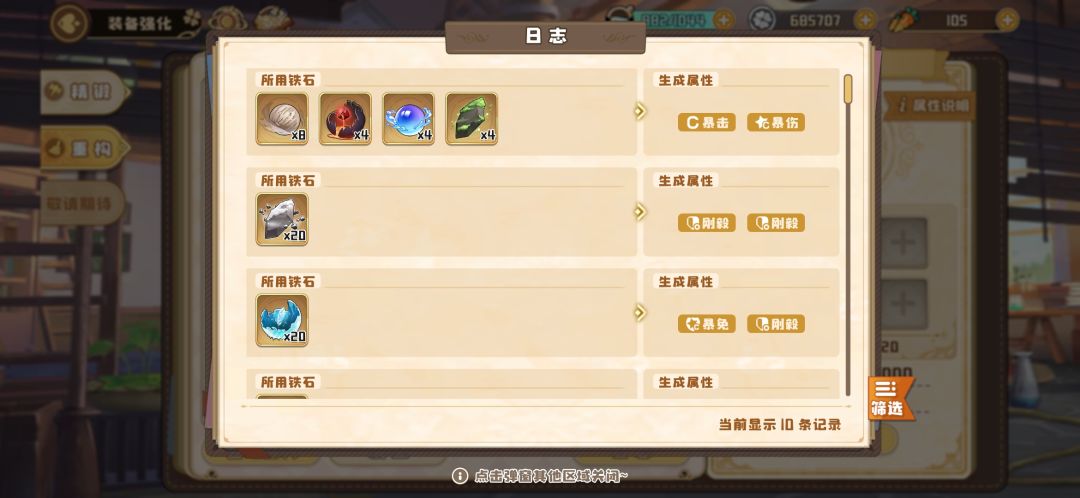 今天第一次试了全部十种铁石,洗出词条如下,然后我选了其中四种出了单条暴击和单条爆伤的铁石混合,一次就洗出来暴击加爆伤,我认为这其中肯定是有规律,由于银币不够用,每组铁石(20个)只试过一次,仅供参考。