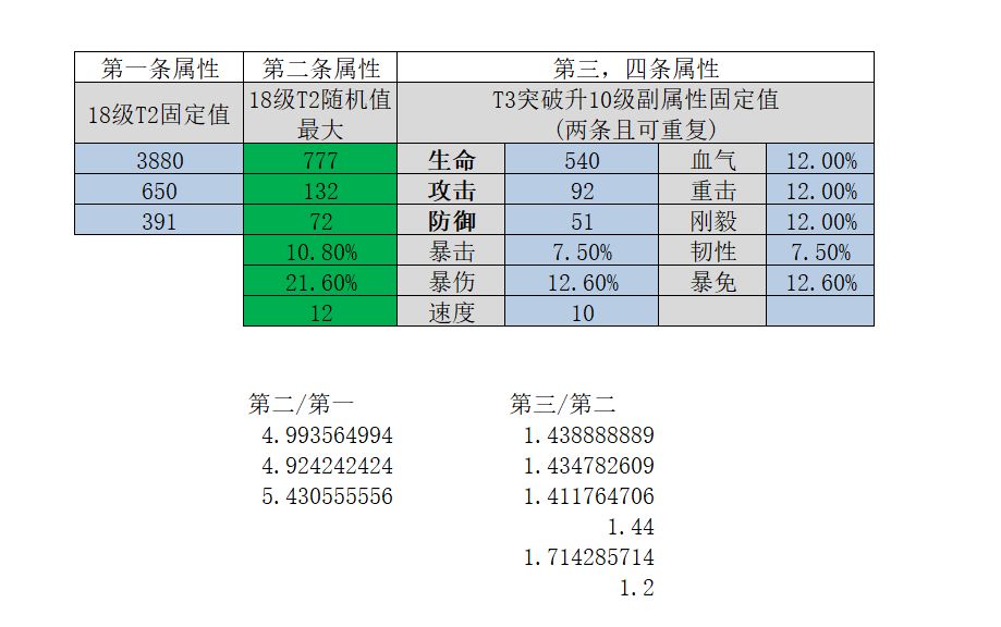 第一条属性没啥好说的,T2后升18级就满了,头饰加防御,项链加生命,戒指加攻击 第二条属性也是和第一条一样初始就有但是种类和数值不固定 第三,四条是T2升18后突破T3才有的,可以用突破T3的材料洗,还比较良心,你完全可以先升再洗不影响 有以下结论: 1.一个装备留还是仍一开始就定了,就是看第二条属性的T2突破属性预览,反正第三四条可以洗 2.T3突破的属性有的给的多,有的给的少,对于勇