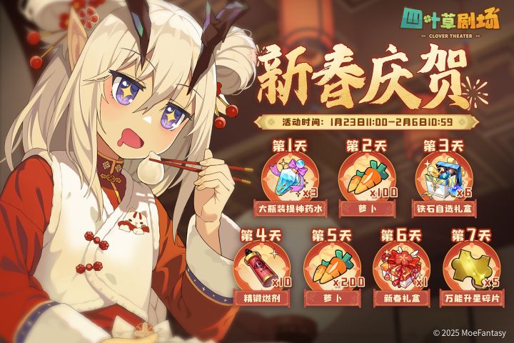 活动期间每日登录游戏,累积7日即可获得全部奖励,内含"万能升星碎片"等丰厚奖励活动时间:1月23日更新后-2月6日10:59第1天:大瓶装提神药水*3第2天:萝卜*100第3天:铁石自选礼盒*10第4天:精锻燃剂*10第5天:萝卜*200*6第6天:新春礼盒*1第7天:万能升星碎片*5