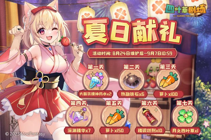 活动期间每日登录游戏,累计7日即可获得全部奖励,内含“月之四叶草”等丰富奖励。活动时间:8月24日维护后 - 9月7日10:59第1天:大瓶装提神药水*2第2天:热融铁石*6第3天:萝卜*100第4天:深渊精华*7第5天:萝卜*150第6天:精锻燃剂*10第7天:月之四叶草*1