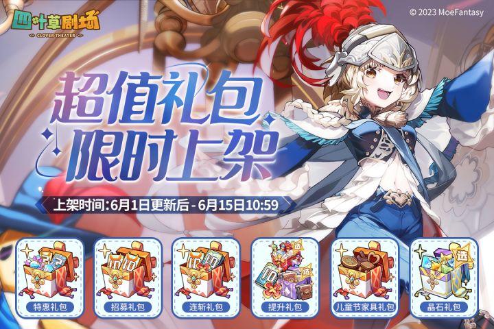 上架时间:6月15日更新后~6月29日10:596月15日更新后,【礼包商城】内将上架多款超值礼包,各位团长不要错过哦~◆【特惠礼包】内含:单抽券*1、剧照单抽券*1、大瓶装提神药水*3、萝卜*100,售价:60魔晶萝卜,限购1次。◆【招募礼包】内含:十连券*2,售价:1280魔晶萝卜,限购2次。◆【连斩礼包】内含:十连券*1,星之四叶草*1,剧照十连卷*1,售价:1680魔晶萝卜,限购2