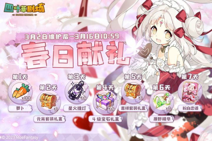 活动期间每日登录游戏,累计7日即可获得全部奖励,内含限定剧照等丰富奖励。活动时间:3月2日10:59~3月16日10:59第1天:萝卜*100第2天:元宵套装礼盒*1第3天:星火提灯*2第4天:4级宝石礼盒*2第5天:吉祥套装礼盒*1第6天:原野精华*8第7天:剧照「粉白恋语」*1