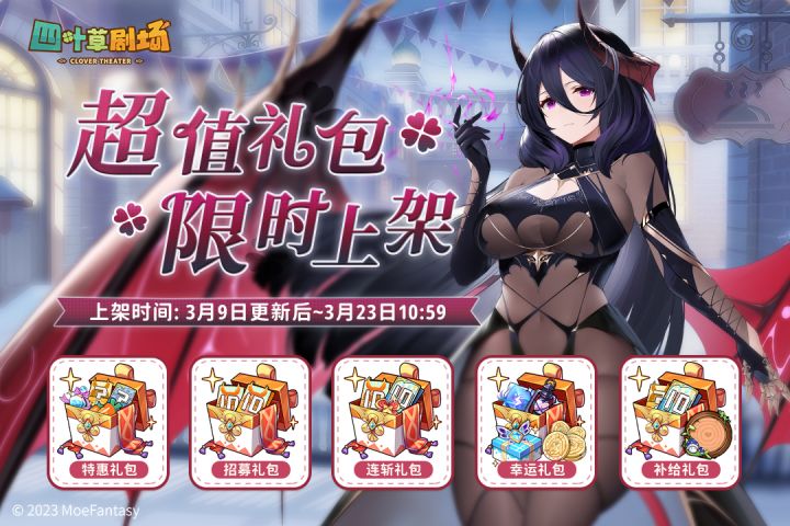 上架时间:3月9日更新后~3月23日10:593月9日更新后,【礼包商城】内将上架多款超值礼包,各位团长不要错过哦~◆【特惠礼包】内含:内含:单抽券*1、剧照单抽券*1、大瓶装提神药水*3、萝卜*100,售价:60魔晶萝卜,限购1次。◆【招募礼包】内含:十连券*2,售价:1280魔晶萝卜,限购2次。◆【连斩礼包】内含:十连券*1,星之四叶草*1,剧照十连卷*1,售价:1680魔晶萝卜,限购