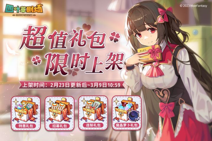 上架时间:2月9日更新后~2月23日10:592月9日更新后,【礼包商城】内将上架多款超值礼包,各位团长不要错过哦~◆【特惠礼包】内含:内含:单抽券*1、剧照单抽券*1、大瓶装提神药水*3、萝卜*100,售价:60魔晶萝卜,限购1次。◆【招募礼包】内含:十连券*2,售价:1280魔晶萝卜,限购2次。◆【提升礼包】内含:十连券*1,专属精华自选礼盒*56,星之四叶草*2,职业技能册自选礼盒*