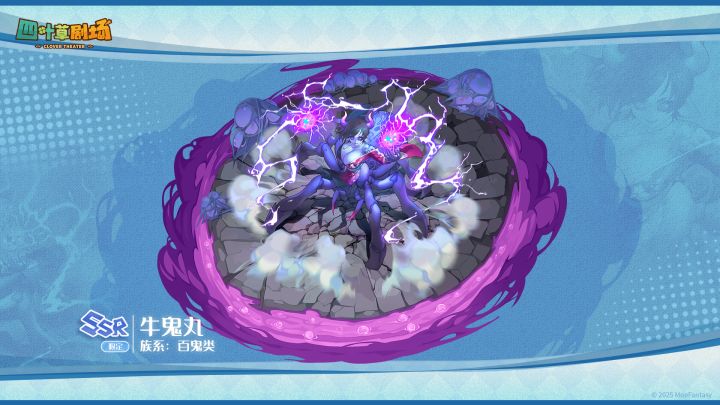 【新演员登记】牛鬼丸稀有度:SSR牛鬼是百鬼中的一个分支,她们一般生活在沿海地区,头上长有牛角和牛耳,下半身形似蜘蛛,有着三对蜘蛛足。牛鬼善于用毒,其毒气可使中毒者衰弱,严重情况可能致死,但她们并不会随意攻击他人。牛鬼一族恩怨分明,对招惹她们的人,她们绝不手软,但对她们有恩者,她们也会全力回报。同时,牛鬼也非常忠心,一旦认定效忠对象,便不会轻易动摇。牛鬼丸是五姬的下属,千神的高级将领,在加入