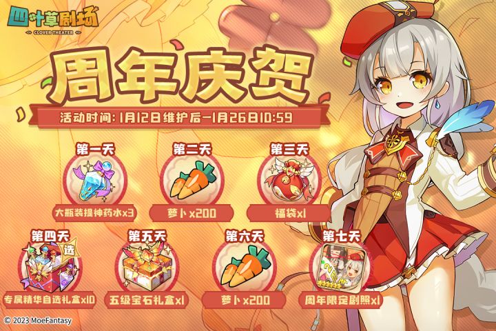 活动期间每日登录游戏,累计7日即可获得全部奖励,内含萝卜、周年限定剧照【二周年欢庆会】等丰富奖励。活动时间:1月12日更新后~1月26日10:59第1天:大瓶装提神药水*3第2天:萝卜*200第3天:福袋*1第4天:专属精华自选礼盒*10第5天:5级宝石礼盒*1第6天:萝卜*200第7天:剧照【二周年欢庆会】*1#游戏资讯