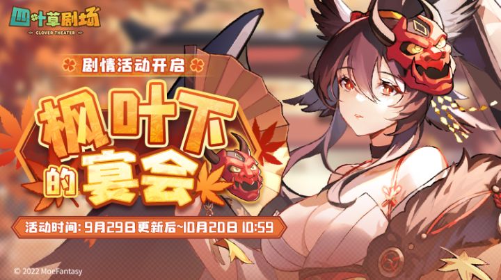 「枫叶下的宴会」剧情活动限时开启活动时间:9月29日更新后 — 10月20日10:59“葛夜拜启,许久未见,别来无恙。”“深秋已至,枫叶渐红,千神的街道上也被这片片红叶所点缀。”“贝伦应该也是同样的景象吧,一想到我们已经可以怀揣着同样的愿景欣赏这同样的美景,我的心头就不禁涌起一阵暖意。”在葛夜的邀请下,来自千神的五姬等人决定前往贝伦庆祝赏枫节,四叶草剧团负责节日的筹备工作。为了让节日活