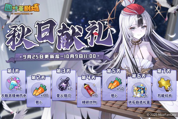 活动期间每日登录游戏,累计7日即可获得全部奖励,内含“万能升星碎片”等丰富奖励。活动时间:9月25日维护后 — 10月9日11:00第1天:大瓶装提神药水*2第2天:萝卜*100第3天:星火提灯*2第4天:精锻燃剂*10第5天:萝卜*150第6天:铁石自选礼盒*6第7天:万能碎片*5