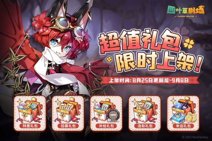 售卖时间:2022年8月25日更新后~2022年9月8日11:008月25日维护后,【礼包商城】内将上架多款超值礼包,各位团长不要错过哦~◆【补给礼包】内含:【电焊天才】头像框、剧照十连券*1、大瓶装提神药水*2,售价:680魔晶萝卜,限购1次。◆【特惠礼包】内含:单抽券*1、剧照单抽券*1、大瓶装提神药水*3、萝卜*100,售价:60魔晶萝卜,限购1次。◆【招募礼包】内含:十连券*2,售