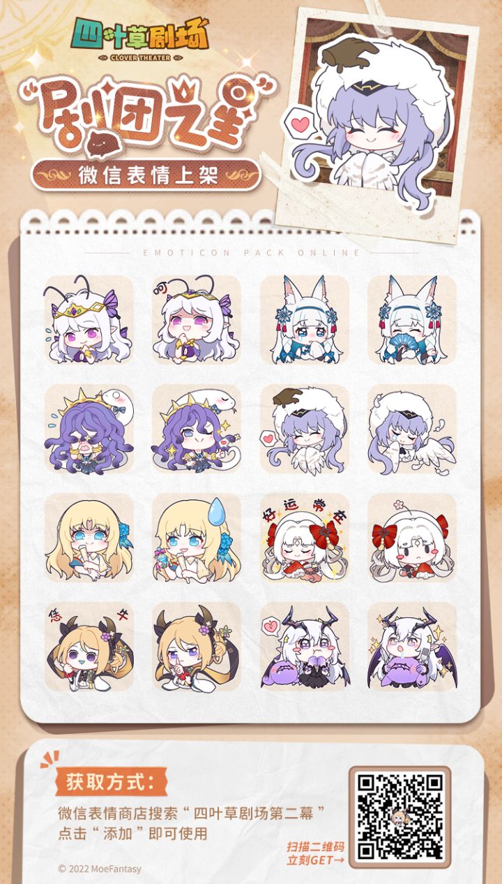 七夕心动之日,奈拉带着“剧团之星”表情包来啦记录着演员们的各种有趣日常,让她们多多出现在团长的聊天框吧~微信获取方式:方法一:长按识别或打开微信扫描下方图片中的二维码,随后将跳转至表情页面中。方法二:打开【微信】-【我】-【表情】搜索【四叶草剧场第二幕】,点击“添加”即可表情。