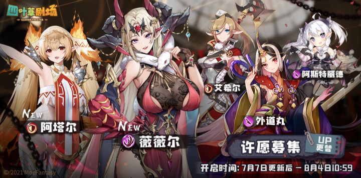 【许愿募集更替】许愿角色:阿塔尔【new】、薇薇尔【new】、艾希尔、外道丸、阿斯特丽德开启时间:7月7日更新后 - 8月4日10:59许愿募集更替后 ,团长可在【演员募集>许愿募集】中从上述许愿演员中选取2个角色进行UP!