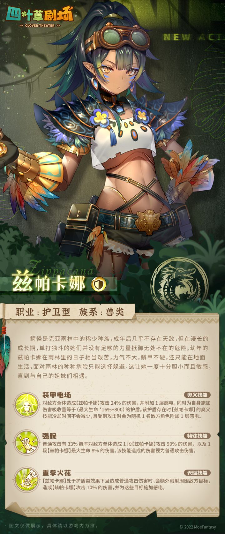 稀有度:SSR鳄怪是克亚雨林中的稀少种族,成年后几乎不存在天敌,但在漫长的成长期,单打独斗的她们并没有足够的力量抵御无处不在的危险。幼年的兹帕卡娜在雨林里的日子相当艰苦,力气不大,鳞甲不硬,还只能在地面生活,面对雨林的种种危险只能选择躲避。这让她一度十分胆小而且敏感,直到与自己的姐妹们相遇。
