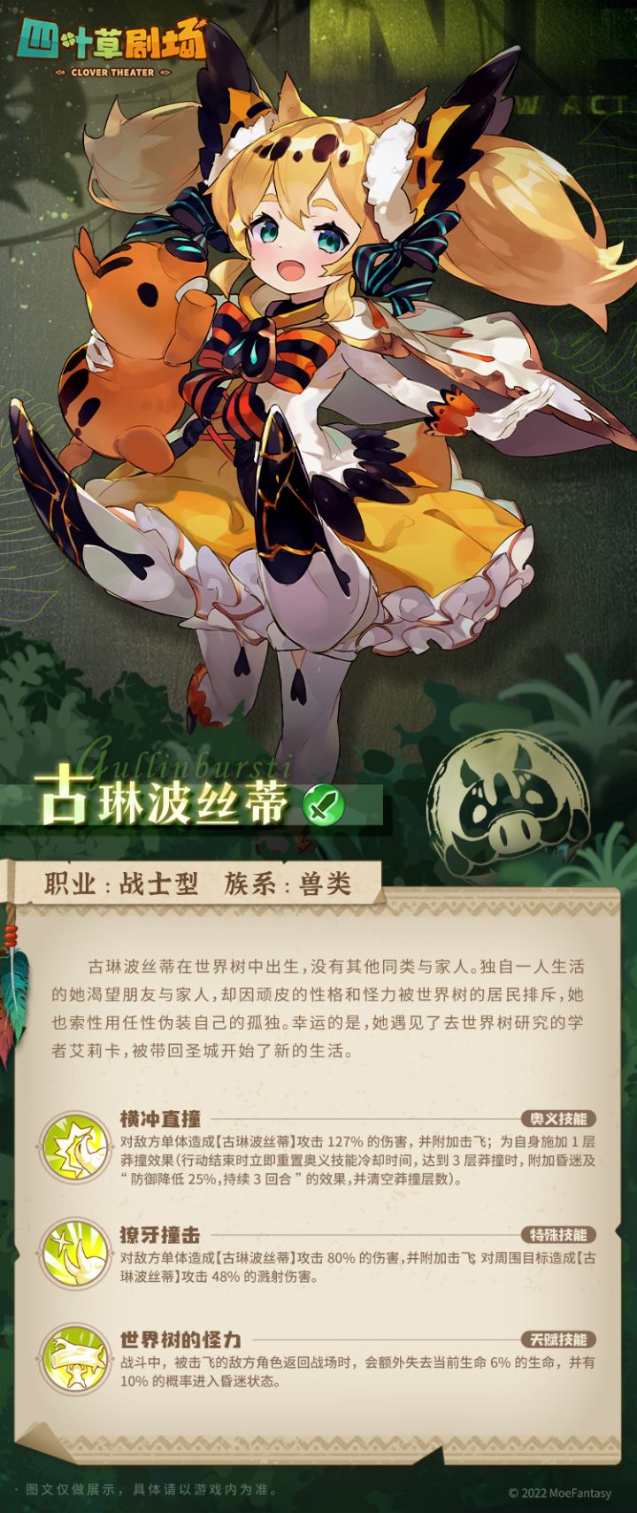 稀有度:SSR古琳波丝蒂在世界树中出生,没有其他同类与家人。独自一人生活的她渴望朋友与家人,却因顽皮的性格和怪力被世界树的居民排斥,她也索性用任性伪装自己的孤独。幸运的是,她遇见了去世界树研究的学者艾莉卡,被带回圣城开始了新的生活。