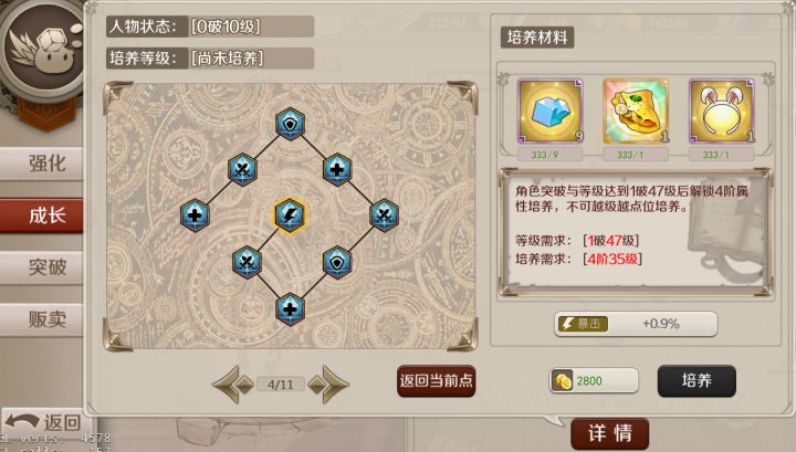 关于成长培养系统22级开放,随着培养进程推进,需要更高的人物等级和突破阶段才能继续培养属性培养主要消耗的道具能量材料:主要通过分解、合成多余的装备、幻兽、材料获得黄金料理:主要通过把普通料理合成为高级的黄金料理获得礼物材料:主要通过掉落和好友送礼获得黄金料理的合成素材,礼物等也有每日礼包出售培养系统适合高等级有积累的玩家追求,初期效果不明显但累计效果可观培养槽大致区分战士、辅助