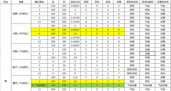漏了一个闪避拳,不整理了很多人看不懂就补一下内容,表格为参考。下面装备+经脉裸属性(保留性价比极高的属性后的情况)1.韧性拳:152%韧性 10%免伤2.招架免伤拳:114%招架,33%免伤,86%韧性3.反震免伤拳:91%反震,20%免伤,95%韧性首先 贫民拳:韧性和防御往死了怂 (别去想什么招架,反震等),万金油!!!!其次 招架拳:招架拳成型缺少防御,建议九宫(防御)+北冥(免