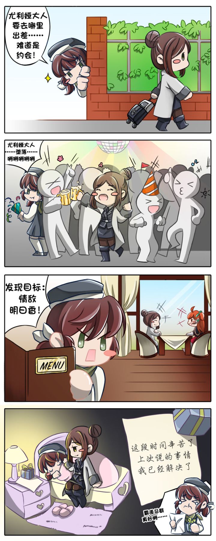 荷塞拉二三事的四格漫画不知不觉停更了快1个月。。唔。。。期间感谢各位对漫画的关心【虽然更关心什么时候开服o(╥﹏╥)o】国服目前的优化还在进行中,结合了已经知晓的韩服出现的一些问题不断修正~希望到时候一次性给大家一个更好的版本~~~那么来看看这期吧!塞拉和尤莉娅之间的故事~~觉得很多脑补党要出现了!本来以为尤莉娅大人出门不喊我~肯定是。。。唔。。干什么不好的事情了。。虽然好像花天酒地