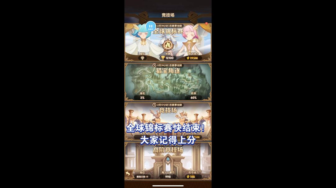 【进攻和防守的区别】 进攻是挑选别人的队伍作战,可以放弃敌方过强的队伍。打钻石局可以只组3队。 防守被别人挑选,每队的战力都需要平均一些。5队都要组。 【多打】 每天免费次数尽量打完,不管是自己上分还是送别人上去。因为同分数输的时候掉的分比赢得时候涨的分少,所有大家总体打的次数越多,整体分数越高,越容易上分。 【挑时间上大段】 平时打完免费买完前两次票(也可以只买一次)集中冲大段。在冲大段的时候,