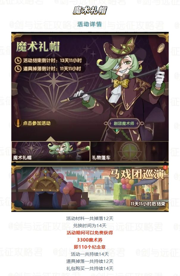 哈喽各位铁汁们,还是熟悉的配方还是熟悉的味道。那么今天攻略君给大家带来魔术师活动 氪金&兑换指南。欢迎各位铁汁文末留言区交流,文章基于个人游戏理解,制作不易,仅供参考,不喜勿喷。 活动材料一共掉落12天,兑换时间为14天。活动期间可以免费获得3300魔术券即110个纪念章。活动一共持续14天,道具掉落一共持续12天,礼包购买一共持续14天。 活动须知30个魔术券可以抽一次,抽十次才可以获得10个纪