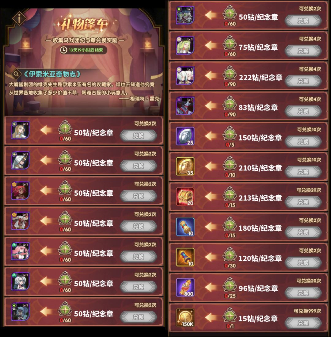 前言 其实之前的活动小编也做过活动的性价比分析 不过中间出了好几次翻盘子太看脸没法计算,鸽了好久了, 这次把这个系列捡起来。 友情提示: 计算过程较多,可以直接跳到文章最后。 一、本次活动收益 本次活动收益是 两部分 一部分是纪念章兑换物品 纪念章兑换物品及性价比 10次魔术屋抽奖给10个纪念章, 按照最高的双子价值计算, 每次抽奖价值 222钻石 另一部分是魔术屋抽奖 满足一定条件后会增加特殊奖
