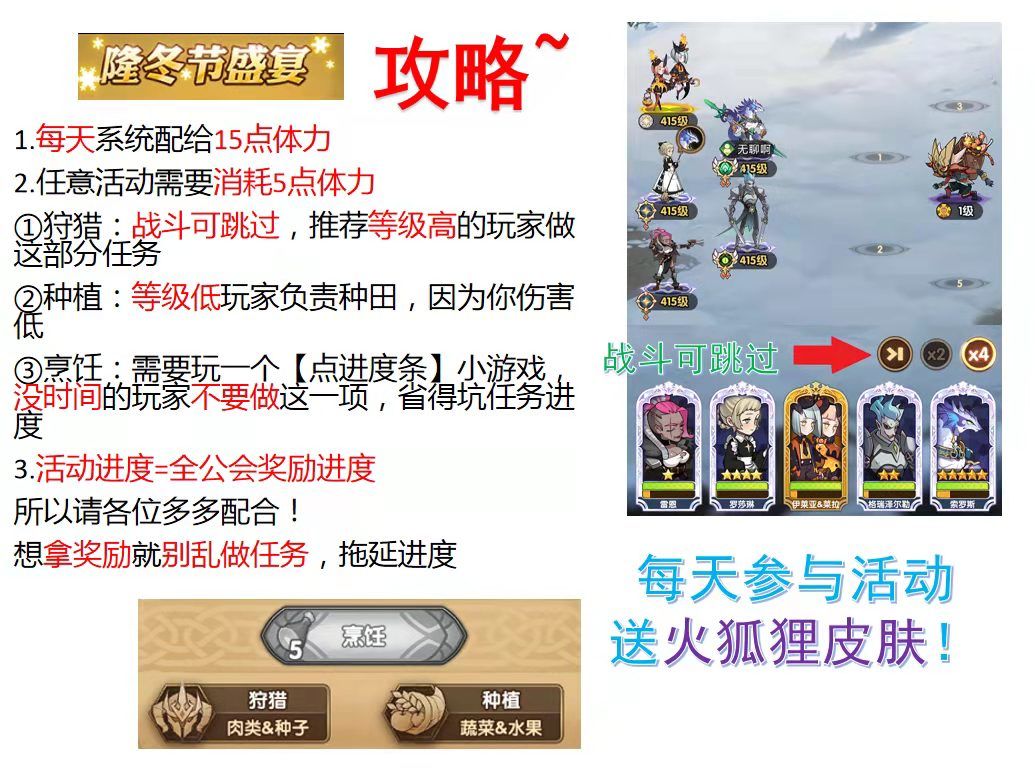 活动攻略送上! 建议想省时间的不要去做【烹饪】的选项, 因为要玩小游戏, 点中进度条才能增加烹饪进度, 点不中就等于浪费了烹饪材料! 这个活动需要全个公会互相配合! 进度=奖励,进度=奖励,进度=奖励!!!