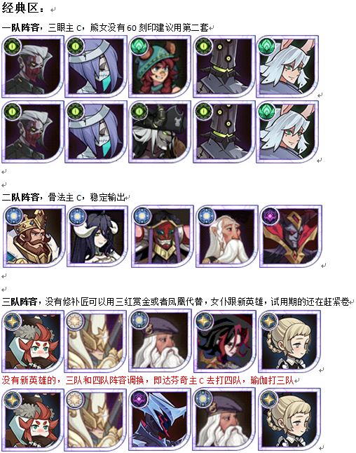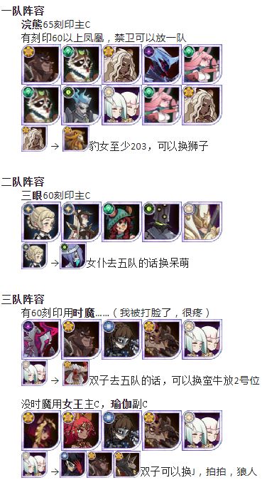 梦魇回廊平民阵容 平民一队:试用蕾姆 无高配花木兰换魔女 平民二队:无老凤凰换卡拉 平民三队:女仆跟三眼 平民四队:黑妹战力最高 吃赏金技能!无SP巴登换禁卫即可 平民五队:卡拉可换豹女 平民首领:佣兵:黑凤凰 有条件黑凤凰战力最高 吃时针技能 (无时针可换狂鼠) 梦魇回廊难民阵容 难民一队:试用蕾姆 高配花木兰可换魔女 难民二队:双子可换修补匠 难民三队:由于修补匠去了二队 会出现不稳定情况(