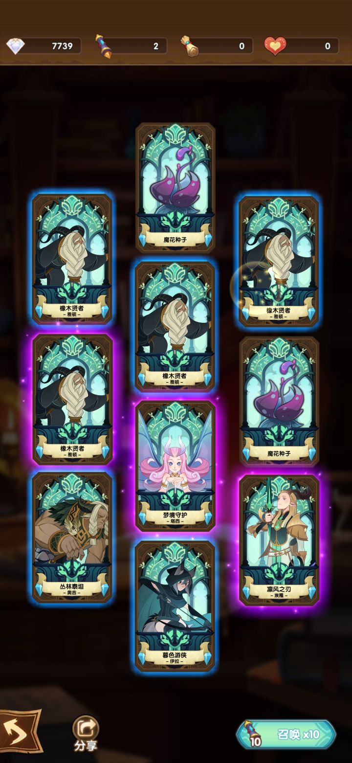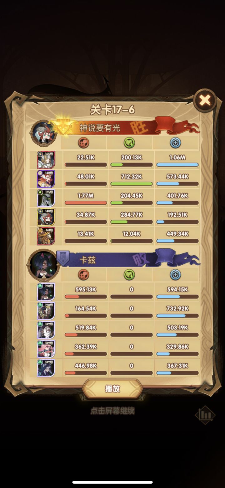 先来个抽卡三紫镇楼!!!哈哈经常逛Tap,但很难刷到绿裔的攻略,因为我开局的时候抽到的蝴蝶和小鹿,所以决定走绿裔了。一开始阵容,狮子,羊头,小鹿,小羊,蝴蝶,羊头高20级,还是比较稳到了161后,女妖刚好可红,就直接切换羊头了,这时候,慢慢发现,狮子有点扛不住了,红了狮子,满心欢喜拿了皮肤,结果发现没有属性加成,尴尬,那会还差点给狮子专属20多一秒不死,忍住了,现在看来,简直大对特对了。所