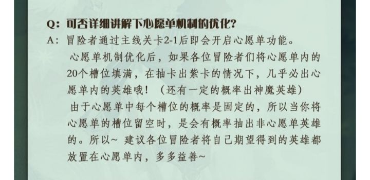 重点心愿单必满!1,心愿单的每个格子提供给0.2205%的概率2,空着的格子为其他所有四族英雄增加概率3,满心愿单的话不会出非心愿单四族英雄,当然也不会出假紫4,神魔概率独立为0.2%(总),不受心愿清单影响机制解析普池心愿单满以当心清单放满的时候,对于普抽精英英雄机率总共是4.61%其中4.41%是心愿清单的紫角总和,而神魔角色的总的几率是0.2%。每一只心颐清单的英雄个别机