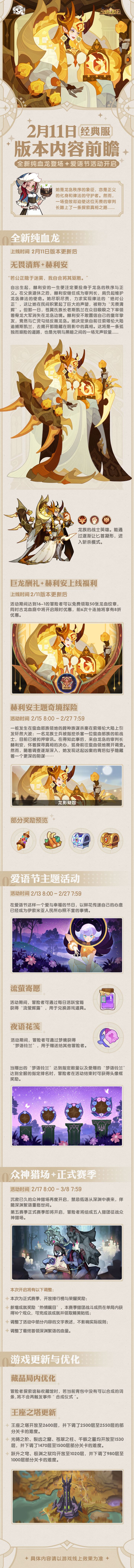 亲爱的冒险者:我们预计将于 2025/2/11 02:00 - 04:00 进行为期两个小时的停服更新维护。维护期间将无法登录游戏,给您带来的不便我们深感歉意,更新完成后我们将会为您发放1200钻石作为补偿奖励。· 新英雄登场 ·1.新增绿裔阵营英雄:群星观测者 - 翠西亚◇ 定位:智力型法师◇ 简述:具备强力的输出能力,并随着战斗逐渐变强。◇ 获取方式:版本更新后,可通过命定召唤获得